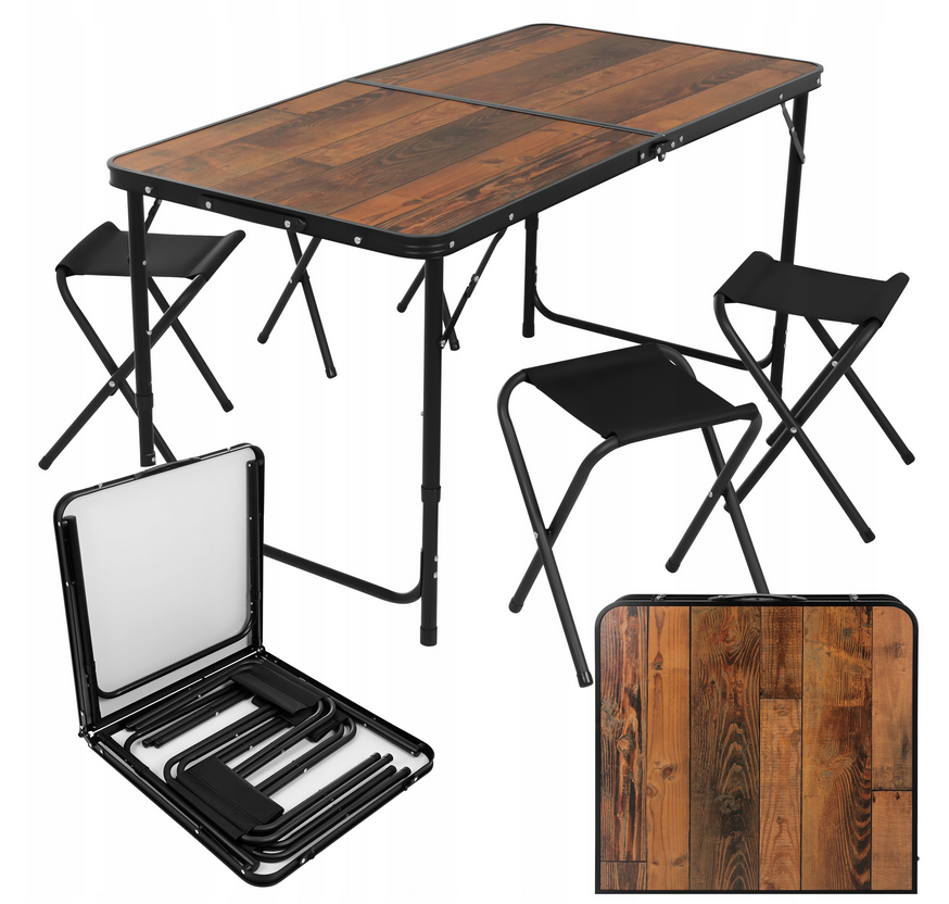 ✅ cały zestaw . składasz do poręcznej walizki, masz 3 poziomy regulacji wysokości stołu, blokady zabezpieczające blat, stabilną lekką konstrukcję oraz 4 krzesła o udźwigu do 80 kg każde - dzięki czemu wygodnie i bezpiecznie korzystasz w ogrodzie, na pikniku i na kempingu