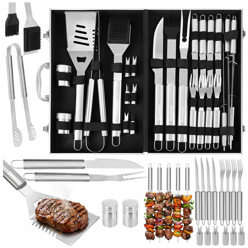 Zestaw przyborów do grilla . 26 el ze stali nierdzewnej + wzmocniona walizka walizka XXL