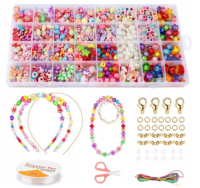 Zestaw elementów do samodzielnego wykonywania bransoletek, naszyjników, opasek na włosy, zawieszek oraz wszelkiego rodzaju ozdób.